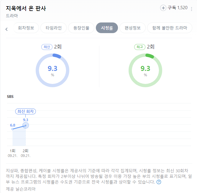 지옥에서 온 판사의 1회 시청률은 6.8%, 그리고 2회 시청률은 9.3%를 기록했습니다. 동일한 날에 1,2회 연속 방송되었는데, 2회 시청률이 조금 더 높게 나온 점도 주목할만한 성과입니다.